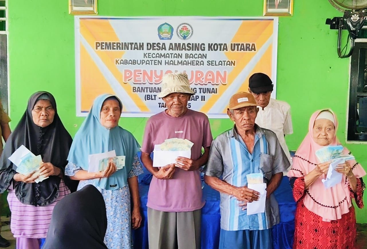 Amasing Kota Utara, Halmahera Selatan- 10 Agustus 2025 — Pemerintah Desa Amasing Kota Utara bersama Camat Kecamatan Bacan dan Badan Permusyawaratan Desa (BPD) Amasing Kota Utara menuntaskan penyaluran Bantuan Langsung Tunai (BLT) tahap II tahun 2025. Kegiatan ini juga sekaligus menjadi momentum penyaluran insentif bagi kader Posyandu/Posbindu serta guru mengaji untuk periode Juni–Desember 2025.